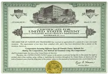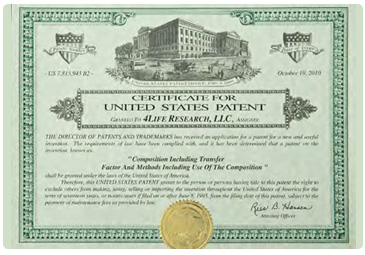 Компания вкладывает много ресурсов в патентование, поскольку понимает важность защиты бизнеса дистрибьюторов. Патенты гарантируют потребителю уникальность продукта и юридическую защиту этой уникальности. Работа 4Life в научном направлении и защита продуктов патентами демонстрируют долгосрочную верность компании принципам эксклюзивности и стабильности. 4Life имеет 6 патентов в США, 38 патентов за рубежами США, а также десятки патентов ждут одобрения.